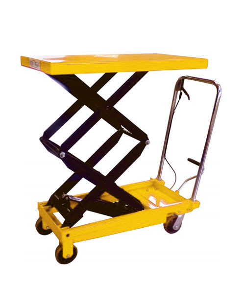 Scissor table lifts higher for easier shelf stocking.
